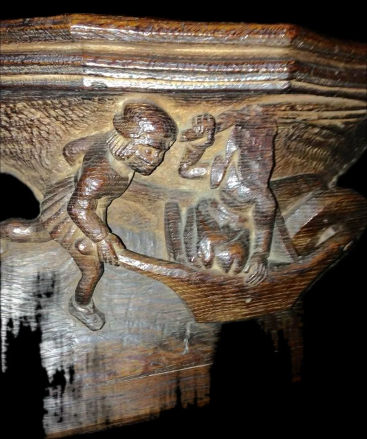 One of our volunteers, Terry, who also serves as a Cathedral guide, recommends looking out for the misericords in the Tunstall Chapel. These “mercy seats” were hinged wooden supports allowing clergy to rest during long services, often carved with humorous or symbolic figures beneath. One depicts a farmer pushing his drunken wife home in a wheelbarrow, perhaps echoing the old rhyme: