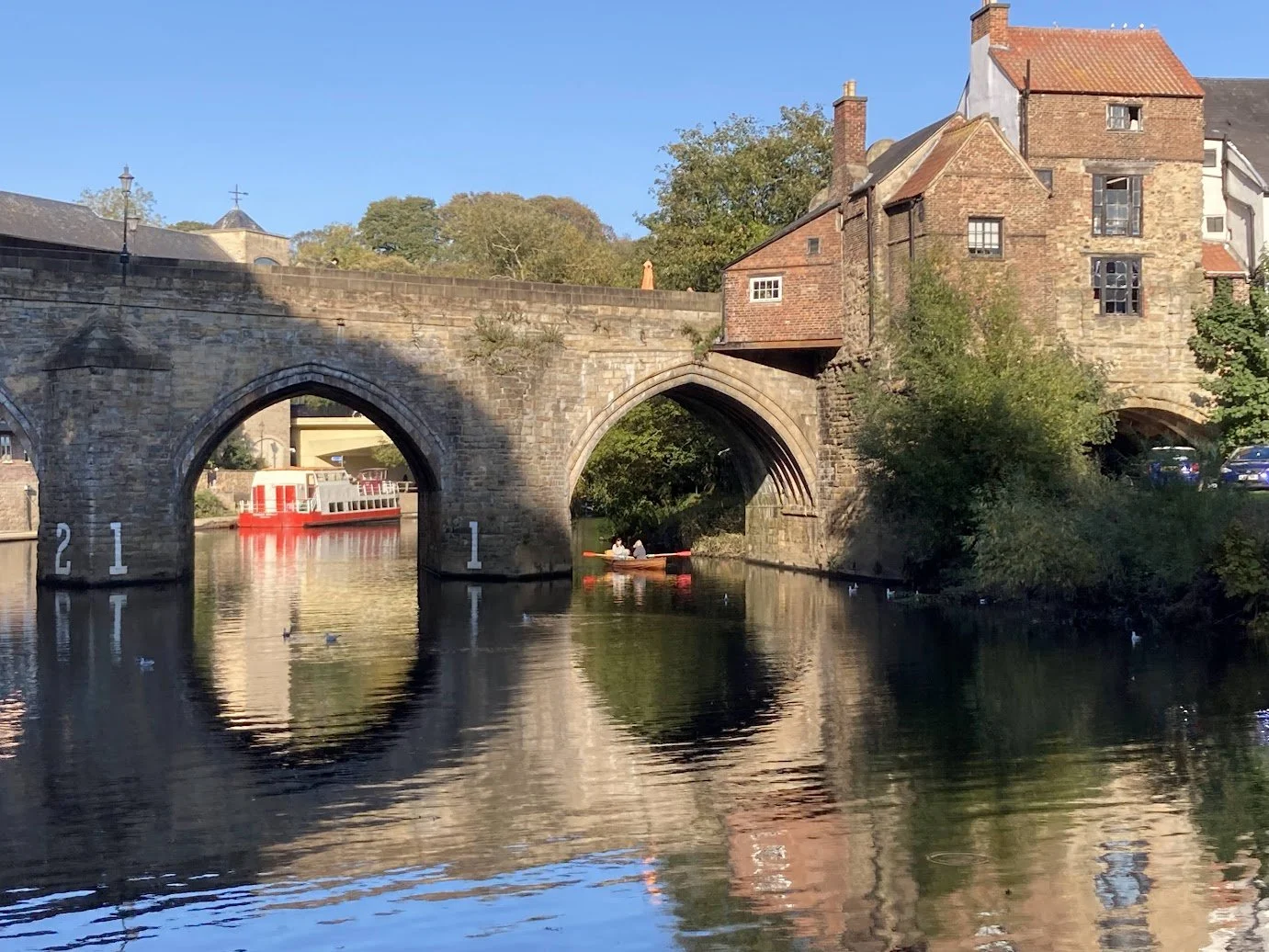 I always enjoy the view of Elvet Bridge walking on from Kingsgate. The remaining little buildings at one end make it easy to imagine what it looked like when shops lined the bridge from end to end. Gary Bankhead, a local diver, has recovered many fascinating artefacts from the riverbed near this bridge; some are on display at the archaeology museum in Palace Green Library.